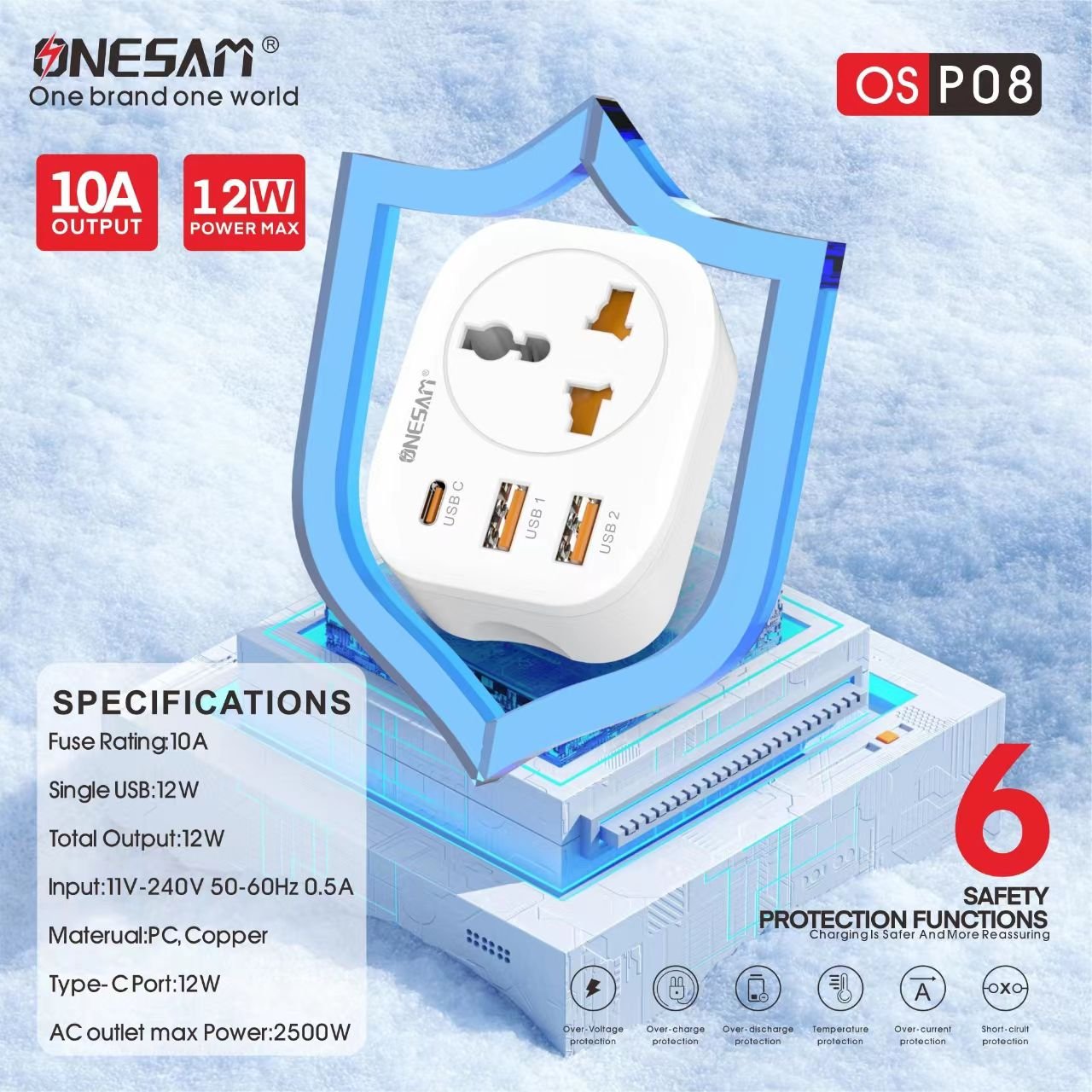 Onesam Extension multiplug 1Electric+2USB+1Tc PDport/12W max 10A (OS-P08)